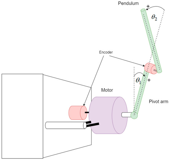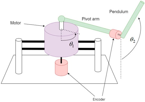 The rotary inverted pendulum represents a unique variant of the inverted pendulum, distinct from the cart inverted pendulum, which is governed by the linear back-and-forth motion of a cart. To assemble the rotary inverted pendulum, we affixed a connecting pivot arm to a servo motor’s shaft, employing rotational torque to manage another connecting pendulum fastened to its trailing end. When the connecting pendulum remained motionless, it hung vertically due to gravity. Upon applying a driving torque, it overcame gravity, assuming an upright vertical position. Consequently, it did not follow a linear path but instead executed a circular rotation. The control principles for this system resemble the control laws detailed in this paper. Both systems are interconnected, nonlinear systems, where a single input governs two outputs. The connecting pivot arm’s position transitioned from 0 degrees and eventually returned to 0 degrees. The pendulum’s position oscillated from 0 degrees to either positive or negative 180 degrees, contingent on its initial rotation direction, whether clockwise or counterclockwise. Figure 6 illustrates the architectural diagram.