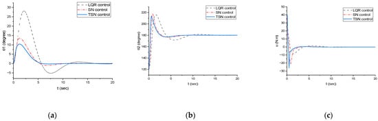 Performance indices serve as quantitative measures to evaluate the performance of the simulation of an inverted pendulum system. These indices provide insights into various aspects, including stability, tracking accuracy, control effort, settling time, and energy efficiency. Figure 5 clearly demonstrates that the TSN controller outperformed both the LQR and theSN controllers.