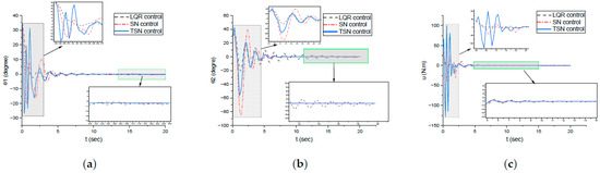 Utilizing the identical approach as illustrated in Example 1, we could obtain the feedback gain as = [−9.8 −114.4 −6.22 −15.48]. The optimal regularization parameter was configured at =0.05, and initial weightings were all set as 0.1.According to Equation (28), the matrics of , , and . The simulation began with initial conditions set to and , and the results are compared to those of LQR and SN in Figure 7.