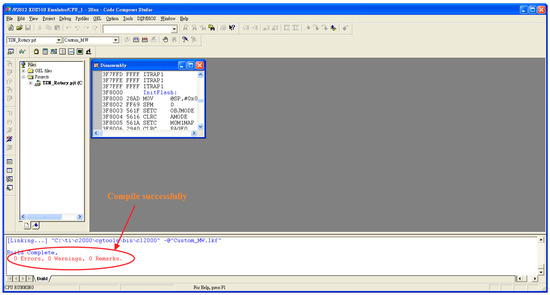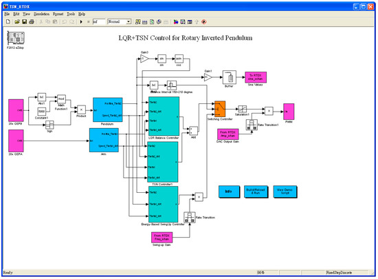 First, the driver software usb20emurst 2.0 needed to be installed and the environment needed to be set up. The actual setup utilized a mechanical module of a rotary inverted pendulum (shown in Figure 10) produced by TeraSoft Inc, Taipei, Taiwan. [29], control board, power supply, and emulator. Its control principle was the same as the simulation, with the only difference being an initial swing-up motion. Once it reached the controllable stage, which was when the angle transmitted by the encoder fell between controllable regions, the proposed TSN decoupled control law was taken over by the controller. The software used included TI (Texas Instruments, Dallas, TX, USA) Inc. CCS 2 (Code Composer Studio 2) [30] and MathWorks Inc., The Natick Mall, MA, USA. MATLAB R14 RTW (Real-Time Workshop R14) and Simulink R14 [31], while the hardware consisted primarily of a driver board powered by the TI F2812 DSP chip. After powering on, the JTAG emulator connection was reset for normal operation, as shown in Figure 11. Then, the Simulink program interface was opened, as depicted in Figure 12. The system, through RTW, automatically burned the code into the TI F2812 chip, as depicted in Figure 13.