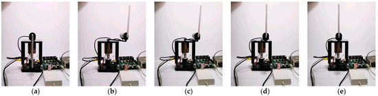 Photographs depicting the stages of arm-driven inverted pendulum experiments with TSN control: (a) initial states; (b) pendulum decoupling initiation; (c) convergence to zero states; (d) stable two-state configuration; (e) achievement of stable steady-states.
