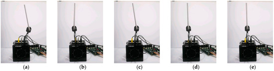 In this experiment, we commenced our investigation by examining the lower coupling effect on the rotary inverted pendulum. Upon activation of the inverted pendulum, it rapidly stabilized, returning to its zero position and angle, as visually depicted in Figure 14. Figure 14 comprises five subfigures: the leftmost one shows the initial photograph, while the middle sections illustrate various stages of the pendulum’s motion, and the rightmost one showcases its stable endpoint. Our results obtained from the TSN controller reveal that the performance of the inverted pendulum control system is notably superior to that of both the SN and the LQR controllers.