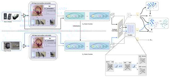 where is a standard cross-entropy loss of all labeled data in the source domain. stands for a linear transformation of the second statistics (covariances) extended by the p-norm to align the distributions of the source and target features. is the self-supervised loss that encourages the model to learn useful information. The corresponding self-supervised task is to predict the index of the chosen permutation in this paper.