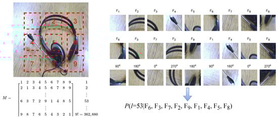 A self-supervised auxiliary task (called Random Context Prediction) module that transforms both given source and target data samples along with two prominent self-supervised techniques was adopted in our framework: context prediction + random rotation. Following [19,21], context prediction, as a “pretext”, forces the model to understand scenes and objects. The main idea is to learn general-purpose representation by exploiting the relative spatial location as labels that come for “free” within images. Doersch et al. [19]’s sample randomly pairs of patches in a three-by-thre grid. In their approach, one tile is the pivot kept in middle of a three-by-three grid; the other can be any of the eight remaining available locations for each pair. In contrast, ref. [21] observes all nine tiles through associating with the Jigsaw puzzle reassembly problem. A set of jigsaw puzzle permutations is defined, as well as the corresponding index for each item. To learn image representation, the Jigsaw puzzle solver shuffles the input tiles base on the set of permutations to predict the relevant index. However, since the number of possible permutations of nine tiles, which is , is too numerous to be applied directly, a subset must be established, which is also time-consuming (see Section 5). In this study, we combine two strategies to create a novel, harder, and more efficient pretext task. Following [21], we generate the subset using “random” sampling rather than Hamming distance. To achieve end-to-end processing, it is also feasible to omit subset creation and just perform random selection in the original matrix. We crop a region from an image at random and divide it into nine patches, which are rearranged according to a randomly selected permutation. At the same time, each patch rotates at a “random” degree, which is generally picked from (see Figure 5).