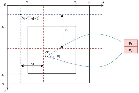 Positional embedding. The middle rectangle indicates the range of , i.e., , . The outer rectangle is the feature map, which is also the range of , the width and height are W and H, respectively. represents the pixel coordinate, the origin is O, and is the relative position with respect to O’.