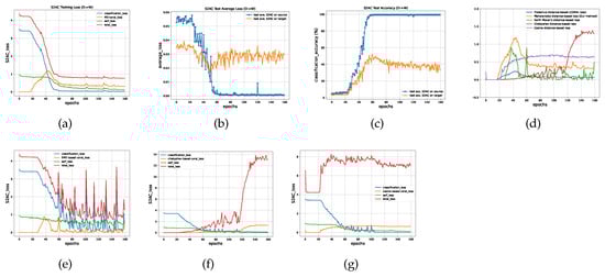 Figure 7 displays us three graphs created from shift to help us analyze S2AC. In Figure 7a, we show the classification loss, the Mahalanobis distance-based CORAL loss, the self-supervised learning loss, and the total loss for the training phrase. The classification loss is initially significantly bigger than both the Mahalanobis distance-based CORAL loss and the self-supervised learning loss, but as iterations progress, the classification loss becomes minimal at around and progressively stabilizes and converges. The Mahalanobis distance-based CORAL loss exhibits a notable growth between iteration cycles 20 and 40, but beyond 50, it steadily declines and converges. In Figure 7b, we visualize the average loss for the test phrase in the source and target domains. The plot shows that the average loss is generally on the decline in both the source and target domains. The fluctuation of the training (source) and test (target) accuracy is shown in Figure 7c. Figure 7d shows the performance of Frobenius distance, Mahalanobis distance, earth mover’s distance (EMD), Chebyshev distance, and cosine distance matrices. The EMD fluctuations are excessively large, and the Frobenius distance-based loss function is weaker than our method in this scenario, while the Chebyshev distance-based loss and the cosine distance-based loss continue to rise in the latter phases, causing the total loss to be poorly converged (see Figure 7e–g).