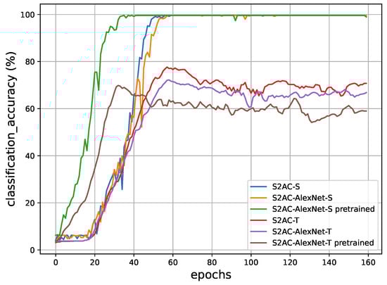 We designed an ablation analysis of the influence of the attention-based backbone network, the self-supervised learning module, and positional embedding. Figure 8 shows the classification accuracy curves. For convenience, ‘-S’, and ‘-T’ denote training and test accuracy, respectively. And incorporation of only the AlexNet [26], instead of the attention-based backbone network, pretrained on ImageNet [27], is called S2AC-AlexNet-S/T pretrained. The corresponding settings are shown in Table 2. The table shows that if AlexNet was replaced by the proposed attention-based backbone network, the test accuracy would increase by about 3% points, mainly benefiting from learning long-range dependencies, which is a main challenge for convolutional neural networks. Furthermore, if the extractor is pretrained, it will converge quicker in both the training and testing phases. But nevertheless, the final accuracy in the training phase is 0.3% points lower for S2AC-AlexNet-S pretrained than S2AC-AlexNet-S, and the test accuracy is about 1.5% points lower for S2AC-AlexNet-S pretrained than S2AC-AlexNet-S. This demonstrates that pre-training has no significant effects on the model’s identification accuracy, but only on its convergence speed. The pre-training procedure cannot be used for S2AC since the brand new backbone network for the weights pre-trained on ImageNet does not exist.