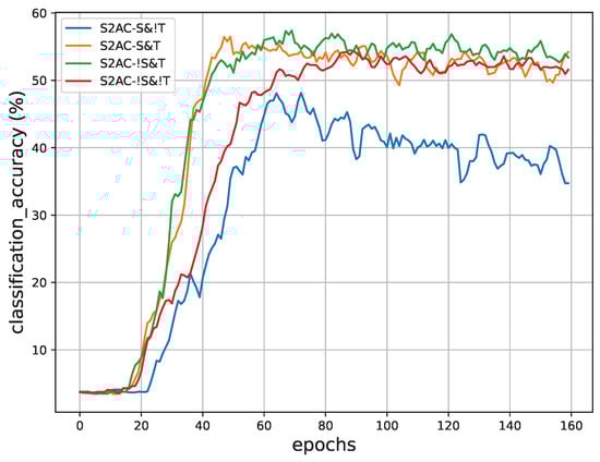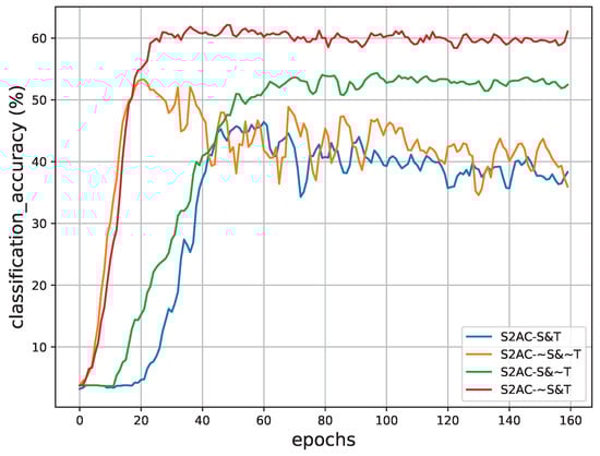 As observed in Figure 10, the self-supervised learning module has made a noteworthy contribution to the enhancement of the model’s test accuracy. In terms of convergence speed and stability of the algorithm, the two models, S2AC-S&T and S2AC-!S, perform the best, with S2AC-S&T exhibiting a faster convergence rate than S2AC-!S. Although S2AC-!S initially displayed the highest test accuracy, S2AC-S&T tends to outperform the previous one towards the end of the iteration. The trend is further evidenced by the F1 scores, where S2AC-S&T’s final score of 83.21% is about 5 points higher than S2AC-!S&T’s score of 78.67%; see Table 4.