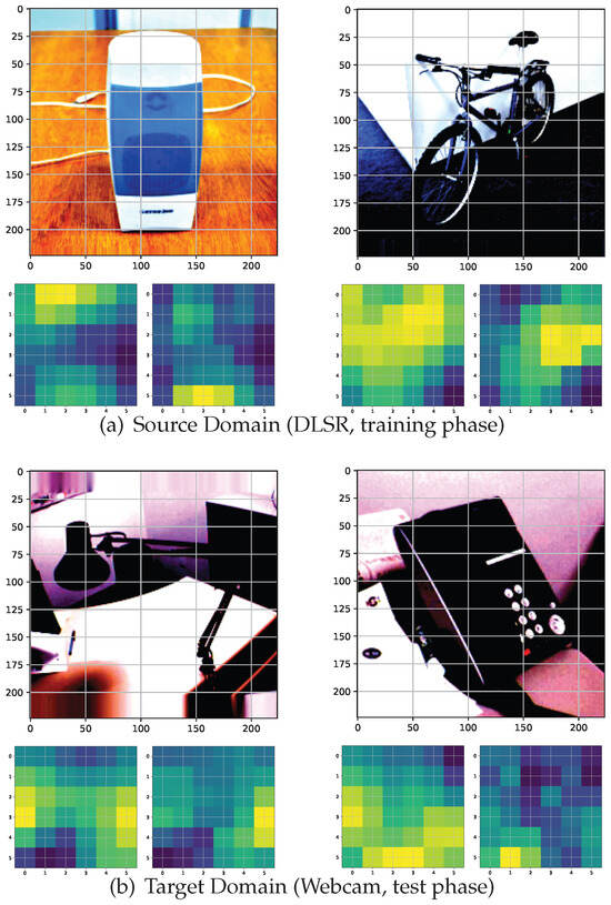 Although understanding the mechanism of deep neural networks can be arduous, certain visual clues reveal that S2AC is capable of fusing two domains to achieve domain adaptation. In order to guarantee fair comparison, we trained both models for 160 epochs. Figure 11 shows feature maps extracted by the model. One can see that the model learned the contour information of the object compared with AlexNet during the training phase (see Figure 11a), while also exhibiting competitive feature extraction capacity during the test phase (see Figure 11b). The first figure of Figure 11a) shows that two regions are activated corresponding to the top and bottom of the object, respectively, in the left, while only the region corresponding to the bottom of the object in the right (extracted by AlexNet). For the test phase, the second figure of Figure 11b demonstrates that S2AC (left) activates the majority of the light-colored areas, and the dark-colored region activated weakly can basically distinguish the shape of the object, whereas the right (AlexNet) cannot represent the outline of the object due to the lack of activated regions.