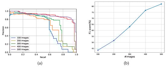 We also investigated the influence of dataset size on domain adaptation. Five training datasets of varying sizes were created and used for evaluation. In addition to the whole dataset, 100, 200, 300, and 400 images were randomly chosen from the source domain to create a new dataset. The corresponding F1 score curves are shown in Figure 12b. From the figure, we conclude that the model’s performance improves as the size of the training set increases. The F1 curve shows a trend of fast forward and slow backward, indicating that the number of images is less than 350 and the F1 score grows rapidly as the number increases. As the dataset size, 350, increases, the performance improvement slows down and tends to saturate. Table 5 depicts F1, recall, precision score, and the micro AP. The corresponding P-R curves are shown in Figure 12a.