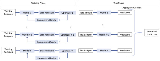 Utilizing diverse training sets to train a classifier proves to be an effective approach to generating independent classifiers [23]. This can be achieved through various methods, with one classic technique being bagging [48,49,50]. Bagging involves creating m training sets of size n from a larger training set by randomly selecting samples with uniform probability and with replacement. Subsequently, the same model is trained on each of these training sets. Figure 2 depicts the bagging process. Examples of this approach to building ensembles include the work of Kim and Lim [51], who proposed a bagging-based approach to train three distinct CNNs for vehicle-type classification. Similarly, Dong et al. [52] applied bagging and CNNs to improve short-term load forecasting in a smart grid, resulting in a significant reduction of the mean absolute percentage error (MAPE) from 33.47 to 28.51. As another example, Guo and Gould [53] employed eight different datasets to train eight distinct networks for object detection. These datasets were formed by combining existing datasets in various ways. Remarkably, this straightforward approach led to substantial performance gains compared to individual models and brought the ensembles’s performance close to the state-of-the-art on competitive datasets like COCO 2012.