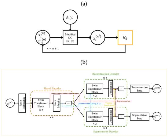 - Sun, L.; Fan, Z.; Ding, X.; Huang, Y.; Paisley, J. Joint CS-MRI reconstruction and segmentation with a unified deep network. In Proceedings of the Information Processing in Medical Imaging: 26th International Conference, IPMI 2019, Hong Kong, China, 2–7 June 2019; Proceedings 26. Springer: Berlin/Heidelberg, Germany, 2019; pp. 492–504. [Google Scholar]