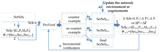 - If the verification result shows no counterexamples and there are updated network environments or requirements, a new version of the security scheme, , is formed.