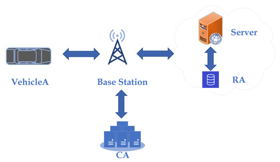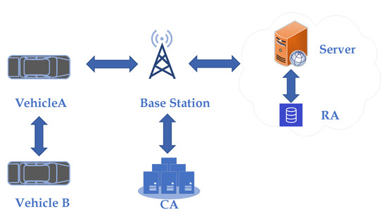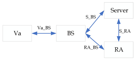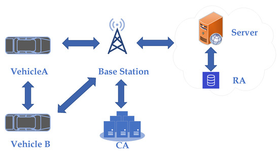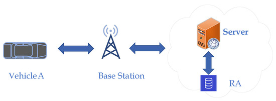 During the deployment period, the evolving security scheme of the IoV will follow the principles of increasing the number of network nodes and increasing the network size from small to large. Therefore, as shown in Figure 2, the network scale of the initial security scheme in IoV is relatively simple, with only four entities: vehicle A (), the base station (), the , and the registration authority (). The is an entity that provides resources for the IoV devices and handles some complex operations. The acts as a “middleman” responsible for forwarding messages between the vehicle and the service network. The is a system responsible for registering vehicles and managing the basic information about vehicles.