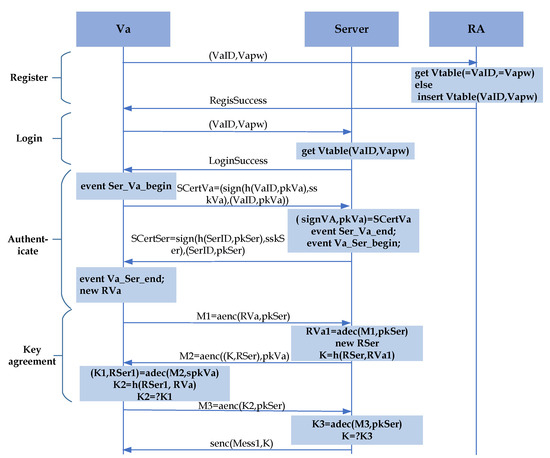 The communication between and the can be divided into three stages, which are: login, authentication, and key agreement. In the login phase, initiates a login information request to the . The , through , enquires whether the vehicle is a registered vehicle, and checks whether the registration information is consistent with the login request sent by . After successful login, the returns to the label of the successful login.