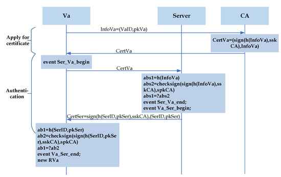 Based on the results of the last round of verification, security flaws in and the authentication were discovered. This round of the authentication scheme was modified to avoid this security issue. As shown in Figure 6, the configuration of the IoV is updated to include a certificate authority (), and the certificate of the is initially set to a digital certificate issued by the . applies for a digital certificate from the , and uses it to achieve mutual authentication with the .