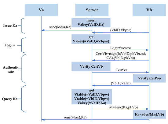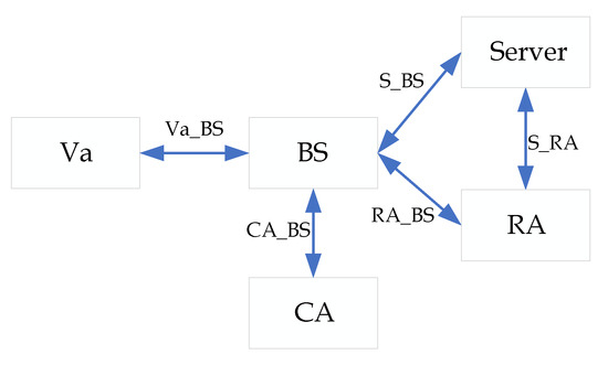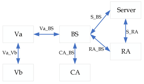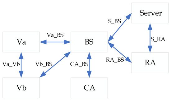 In order to solve the confidentiality of V2V communication, this paper implements the authentication scheme based on the V2V authentication scheme proposed in [17]. As shown in Figure 11, a communication channel between and the is added, allowing to communicate with the through the .