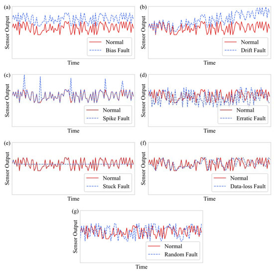 Sample plots of faulty and normal signals, (a) sample plots of bias fault, (b) sample plots of drift fault, (c) sample plots of spike fault, (d) sample plots of erratic fault, (e) sample plots of stuck fault, (f) sample plots of data-loss fault, and (g) sample plots of random fault.