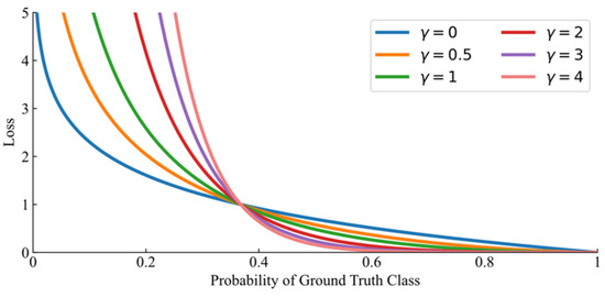 Figure 2 shows the Triage loss when . We amplify the proportion of loss for hard samples using a modulation factor of , making the model focus more on difficult samples. The loss becomes significantly large when , the loss becomes significantly small when . TL exhibits a more pronounced adjustment on the loss compared to FL, reduces the proportion of loss contributed by easy samples, and alleviates the issue of gradient domination by easy samples. When , as the value of increases, the modulation effect of TL becomes more pronounced. When , the TL degenerates to CE. Compared with CE, when , and the loss becomes 1% of CE, and when , the loss becomes five times of CE, increasing the proportion of difficult sample loss in the overall loss. The use of static weighting factor to address the issue of sample imbalance has been proposed in prior works [25,26]. Meanwhile, studies [23,24] have found that the modulation factor and weighting factor interact with each other, and thus these two parameters need to be selected together. In the present work, it was found that the use of a static weighting factor did not lead to higher accuracy in the model. Therefore, in this study, the modulation factor was introduced as a replacement for . After experimentation, it was found that this approach led to improved model performance. During the course of this study’s experiments, it was determined that optimal performance was attained when .