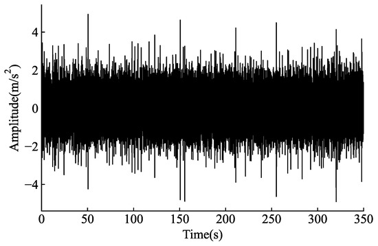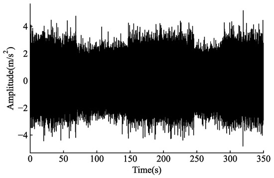 Due to the difficulty of obtaining vibration data with real fault patterns and the lack of publicly available datasets for VSFD, this study uses healthy sensors to acquire vibration data. The seven types of faults are then injected into normal data with varying rates of fault (0.2, 0.4, 0.6, 0.8, 1), as described in the previous section. Other researchers [27,28] have also employed similar methods to obtain fault datasets in their studies. The data used in this experiment were obtained from bearing vibration data on the low-speed and heavy-load test stand. The vibration sensor model is SK601D, and the sampling frequency of the data acquisition equipment was 1 KHz. As shown in Figure 4, vibration data were selected from the equipment monitoring database, and a 350 s signal segment was extracted as the raw data for this experiment. The seven types of faults were injected into the data with different fault rates to simulate faults that occur over very short or very long periods of time. Labels were assigned to the data accordingly, where a value of 0.2 represents the mildest fault with a fault signal proportion of 0.2, and a value of 1 represents the most severe fault. The data were further divided into 70 small samples, resulting in a dataset size of 5 × 8 × 70 × 5000, where there are five different fault rates and eight different fault types, each with 70 samples, and each sample contains 5000 data points. The dataset was split into 5 × 8 × 50 small samples for training and 5 × 8 × 20 small samples for testing. The original vibration data segments are shown in Figure 5.