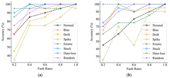 Figure 6b shows the model trained with FL as a loss function and the classification accuracy of each fault type in data sets with fault rates of 0.2, 0.4, 0.6, 0.8, and 1, respectively. With the increase in the fault rate, the overall identification accuracy of the model is gradually improved. However, when the fault rate is 0.6, the performance of the model decreases obviously, and the identification accuracy of Spike, Erratic, Stuck, and Drift decreases somewhat, among which the identification accuracy of Spike declines most seriously. This makes the overall recognition of the model decline even less than the model’s recognition accuracy when the fault rate is 0.4, but when the fault rate reaches 0.8, the accuracy of various categories can still reach more than 80%, but the overall classification accuracy of the model is not high. In general, the overall performance of the model trained with FL as a loss function is not as good as that of the model trained with the default loss function, especially when the fault rate is below 0.6. The gap between the two is obvious, and when the fault rate reaches 0.8 and 1, the performance gap between the two is reduced.