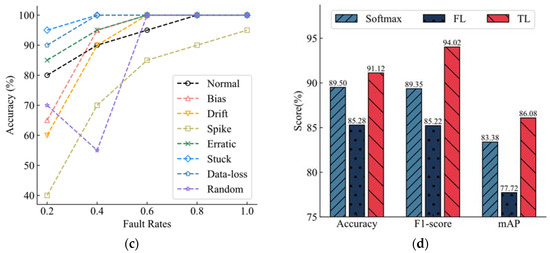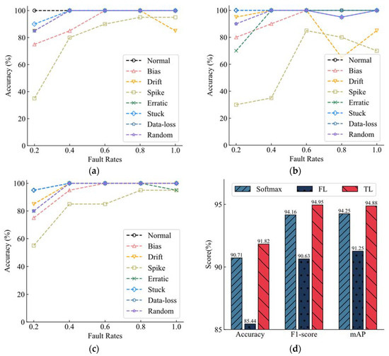 The overall performance of the model is shown in Figure 9d. The average level of the three loss training models under different fault rates is compared. Among them, the TL training model still has the best performance, with the highest scores in the Accuracy, F1-score, and mAP. The model trained with FL had the worst performance, and compared with the model trained with the default loss function, the effect decreased rather than increased, and the decline was serious.