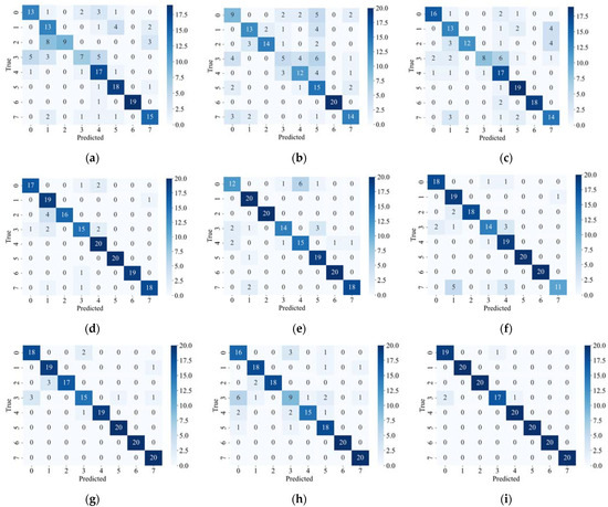 To further illustrate, Figure 6a,b shows the recognition accuracy of the three classifiers for the eight categories under different fault rates. In order to better demonstrate the superiority of the proposed method, Figure 7 shows the confusion matrix of each model under different failure rates. Figure 6a shows the classification accuracy of each fault type in data sets with fault rates of 0.2, 0.4, 0.6, 0.8, and 1 for the model trained using the XGBoost default loss function. It can be seen that the diagnostic accuracy of the model generally increases with the increase of the fault rate, except that the classification performance of the categories Erratic and Drift decreases when the fault rate is 0.6 and 1, respectively. When the fault rate of the model reaches 0.8, the recognition accuracy of all categories reaches more than 80%. When the fault rate reaches 1, the prediction accuracy of other categories of faults reaches 100%, except Drift faults.