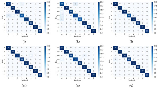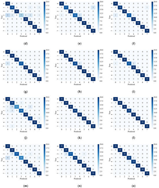 The confusion matrix of models trained with three loss functions under five different failure rates. (a–c) Corresponding to the confusion matrix of models trained with default loss function, FL, and TL at a fault rate of 0.2, respectively. (d–f) Corresponding to the confusion matrix of models trained with default loss function, FL, and TL at a fault rate of 0.4, respectively. (g–i) Corresponding to the confusion matrix of models trained with default loss function, FL, and TL at a fault rate of 0.6, respectively. (j–l) Corresponding to the confusion matrix of models trained with default loss function, FL, and TL at a fault rate of 0.8, respectively. (m–o) Corresponding to the confusion matrix of models trained with default loss function, FL, and TL at a fault rate of 1, respectively.