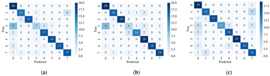 To further illustrate, Figure 9a–c respectively shows the classification accuracy of the model trained with three loss functions at different fault rates. In order to better demonstrate the superiority of the proposed method, Figure 10 shows the confusion matrix of each model under different failure rates. Figure 9a shows the classification accuracy of the model trained using the default loss function for each category at five fault rates. It can be seen that with the increase in the fault rate, the overall accuracy of the model will increase, except for the recognition accuracy of the Drift category which decreases when the fault rate is 1. When the fault rate reaches 0.4, the recognition accuracy of the model for each category reaches more than 80%, and the recognition accuracy of other categories reaches 100%, except for Bias and Spike.