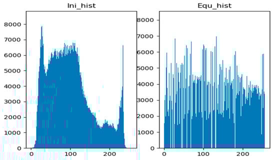 Most threshold segmentation algorithms utilize the valleys of the grayscale image histogram curve to select the segmentation threshold [45,46]. For grayscale images, the histogram counts the occurrence number of each pixel and reflects the function between the image’s gray-scale statistical characteristics and the gray-scale. Due to its low computational cost, the image histogram has been widely used in image processing, particularly in threshold segmentation of gray-scale and histogram equalization to achieve image feature enhancement, etc. [47,48]. Histogram equalization is computationally efficient and fast, and it yields significant enhancement of image features, especially for human visual perception. The following Figure 1, Figure 2 and Figure 3 show the original image, the image after histogram equalization, and the histograms before and after histogram equalization.