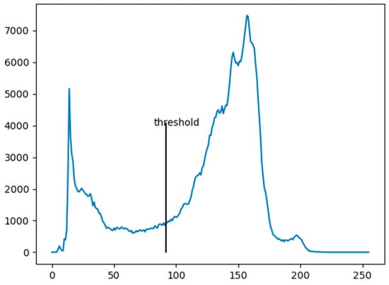 Denoting the threshold for foreground and background segmentation as threshold, the ratio of background pixels to the total pixels number as ω0, the average grayscale value of background pixels as μ0, the ratio of foreground pixels to the total pixels number as ω1, the average grayscale value of foreground pixels as μ1, and the overall average grayscale value of the image as μ, the between-class variance is calculated as σ2max. The OTSU algorithm iterates through each pixel value ∈ [0,255] to find the optimal segmentation threshold that maximizes the between-class variance, as shown in the following formula [49,50]. The algorithm principle of this method is simple, and all types of CV software have mature APIs that can be called, which has been widely applied.