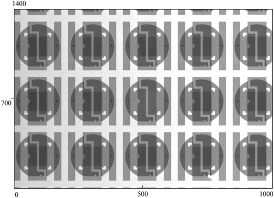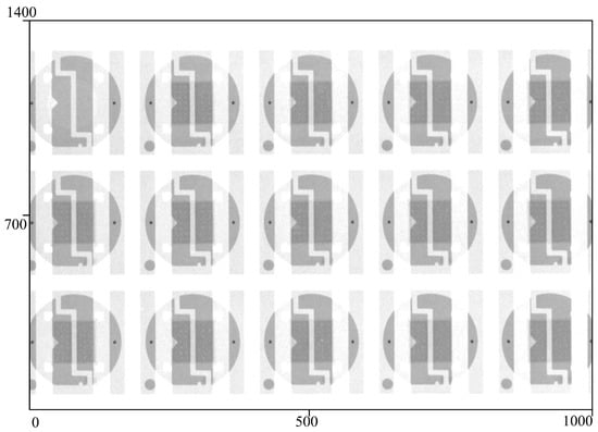 The X-ray image of the underfill under white LED is shown in Figure 7. Each circle represents an LED chip, and the image covers a total of 15 LED chips in a 3 × 5 arrangement. The objective is to detect the adhesion of the underfill in each chip, specifically detect whether the middle solder pad (the square part in the middle) of the chip is missing, and detect the void rate of the solder pad. Since the relative positions of the chips in the image are not fixed during X-ray photography, and some chips may be partially outside the field of view, only 3 × 4 LED chips are visible in the image. Therefore, it is not possible to quickly identify the positions of the solder pads based on pixel locations. The segmentation of each solder pad image is required to evaluate the adhesion. The single image size is 1452 × 1000 pixels, with a 24-bit depth field for a single channel, and the average grayscale of the image in Figure 7 is 159.7. If the OTSU algorithm is used for multi-threshold segmentation, the image segmentation would take about 0.5 s per image. Considering image acquisition, transmission, and post-processing, the overall throughput UPH would not exceed 36 K, which does not match the production line speed.