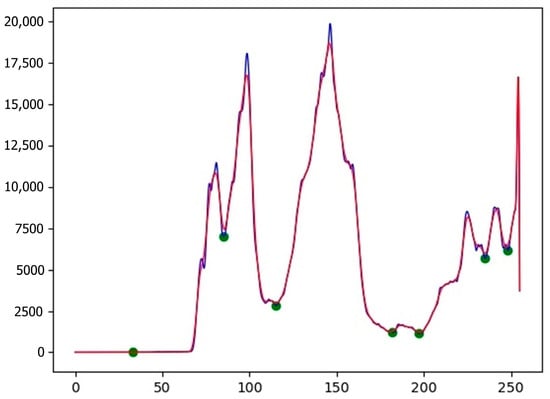 In order to find the extremum points of the histogram curve, an average filter is first applied to perform a certain degree of convolutional smoothing on the histogram curve to remove some burrs. As shown in Figure 9, the blue curve represents the original histogram curve, while the red curve represents the smoothed curve, and a total of seven minimum points are identified from left to right, while the small peak between the fourth and fifth minimum points contains very few image components. Peaks that meet a certain threshold can be set as true peaks, one can be eliminated at either the fourth or the fifth minimum point, or the sixth or seventh minimum point, which do not meet the criteria for true peaks. Therefore, there are three effective segmentation extreme points in Figure 9, which are the second, third, and fifth extreme points, corresponding to four peaks, and a total of four grayscale components in the image. Alternatively, a low-pass filter can be applied repeatedly until the desired number of peaks remains in the histogram, and then the threshold can be determined using the extremum points. In practical processing, the reasonable number of peaks in the histogram can be determined based on the actual situation. Small peaks and valleys can be filtered out by applying appropriate filtering or setting judgment conditions to select valuable minimum points. Finally, based on the corresponding peaks associated with the desired segmentation parts, the segmentation threshold can be selected from the retained minimum points to achieve fast multi-threshold segmentation of the image.