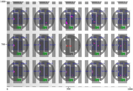 After determining the missing situation and approximate position of the solder pads, the subsequent image processing involves accurately determining the solder pad boundaries and calculating the adhesion of the underfill in the solder pad. As shown in Figure 11, the final calculation and determination outcomes represent the adhesion of the solder pad. This method achieves fast segmentation of solder pads with processing accuracy comparable to the multi-threshold segmentation based on the OTSU algorithm and lower than the region growing method. The entire processing process, including the subsequent calculation of the adhesion of underfill in solder pads, can achieve a UPH of over 70 K, significantly improving efficiency.