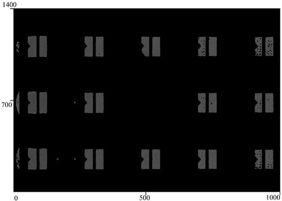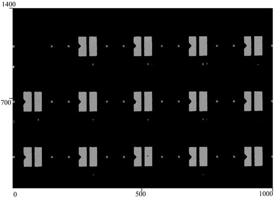In the entire image, the LED solder pad is the darkest region with a gray value closest to 0. Therefore, this part belongs to the peak component with a gray value closest to 0 in the image histogram. Thus, the first and second minimum points are selected as the segmentation thresholds for the solder pad. The portion of the grayscale value in the image segmented using the threshold segmentation method between extremum point 1 and extremum point 2 happens to be the main body and some noise points of the LED pad in the image, as shown in Figure 10. The segmented image can be used to quickly determine the presence of 3 × 5 solder pads, among which the pads in the second row and third column are missing. At the same time, the approximate position of each pad can be quickly determined, providing support for subsequent precise determination of the solder pad boundaries. On a normal PC (Intel Core i5-8250U CPU, 8G RAM), all program codes for image segmentation and processing in the paper are written in Python language. And the total time for image adaptive finding extreme points and split pads is 0.0129 s, which is significantly lower than the time required for the multi-threshold segmentation based on the OTSU algorithm.