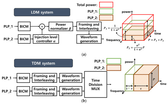 Block diagram of (a) an LDM system with two PLPs, (b) a TDM system with two PLPs.