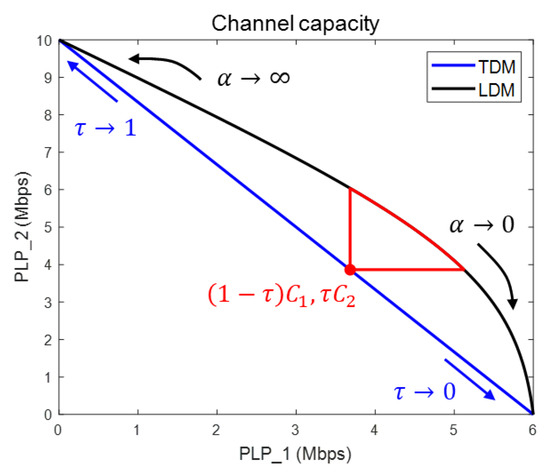 In previous LDM research, many studies have been conducted to prove the superiority of LDM systems over TDM systems by setting specific injection levels and time ratios [5,23]. Figure 2 compares the LDM system with an injection level α and the TDM system with a time ratio τ [11,24]. The graph shows that the LDM system (represented by the red-line area) outperforms the TDM system (indicated by the red dot) regarding channel capacity for both PLP_1 and PLP_2 at a specific τ. However, determining the most efficient α is not straightforward as the channel capacities of the two PLPs are different. No research has been conducted to determine which LDM system is superior under identical conditions (time duration, bandwidth, etc.), that is, which α value is optimal [5,23]. Therefore, we proposed a new analytical method to determine the optimal value of α and configure the most efficient LDM system. Shannon channel capacities and can be defined based on the target received signal-to-noise ratio (SNR) of each PLP [11]. By employing the given SNR, the channel capacity of each PLP in the LDM system can be expressed as a function of α. To determine the optimal value of α, we define the normalized channel capacities of the two PLPs. Normalizing the channel capacity of each PLP allows for a fair comparison of system efficiencies while considering various parameters. The sum of the normalized channel capacities is used to determine the most advantageous combination. Therefore, the most efficient value of α for the LDM system is identified by maximizing the sum of normalized channel capacities.