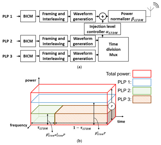 (a) Block diagram, (b) signal configuration of an LTDM with three PLPs.