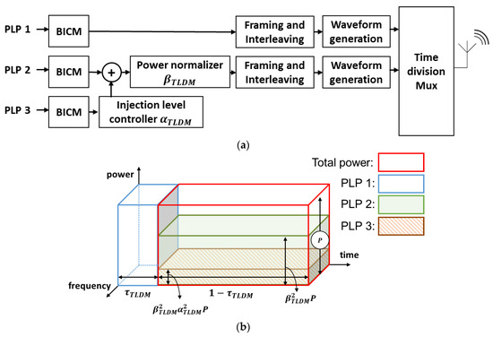 (a) Block diagram, (b) signal configuration of a TLDM with three PLPs.