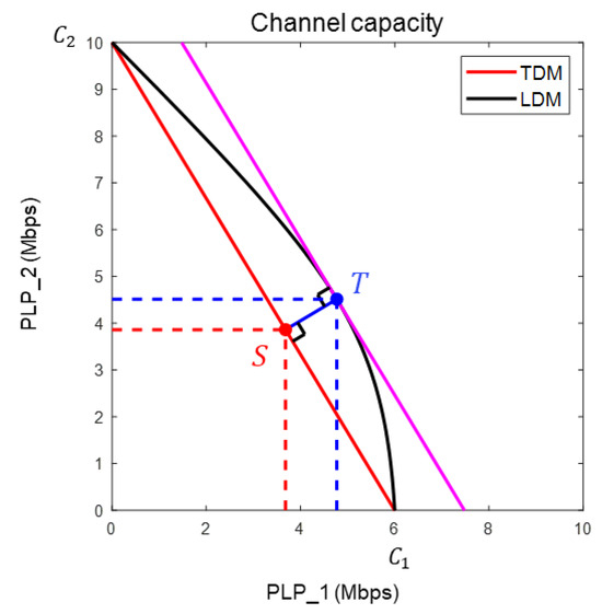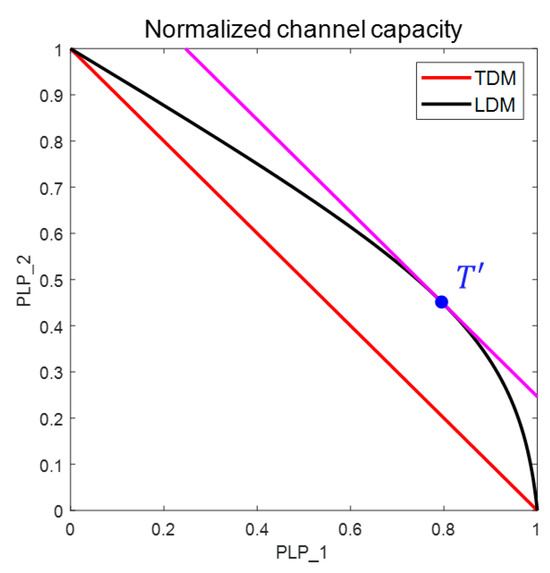 Figure 8 shows the normalized channel capacity of each PLP, as shown in Figure 7. In the 2-PLP LDM system shown in Figure 8, we can identify the point where the sum of the normalized channel capacities is maximized. Geometrically obtaining the maximum sum involves determining the position where is maximized in the linear function of . For the 2-PLP LDM system, the point where is maximized corresponds to , which is a tangent point to the magenta line with a slope of −1. Point represents the normalized position of point T in Figure 7, where point represents the maximum sum of the normalized channel capacities in the 2-PLP LDM system. The point where the perpendicular to the magenta line passes through point and intersects the channel capacity of (the red straight line) is called .
