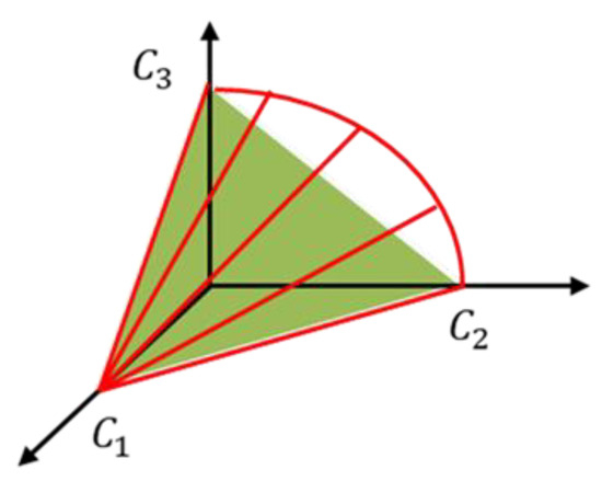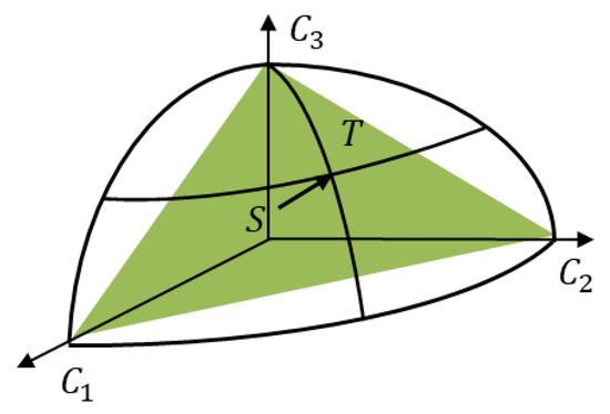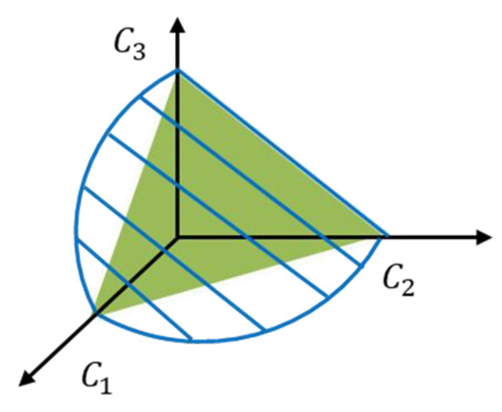 If the above conditions are satisfied, the channel capacities of the LDM and TDM systems can be configured using three PLPs, as shown in Figure 9. In Figure 9, the channel capacity of the TDM system is represented by the green plane, whereas the black spherical area represents the LDM system. We used the value of W = 1 and P = 1 to find the optimal point of T. By substituting and Equations (2)–(4) can be rearranged as follows: