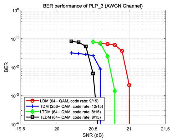 Unfortunately, it is difficult to find a ModCod supported by ATSC 3.0 that matches channel capacity as obtained using the Lagrange multiplier method. Therefore, we set the ModCod to perform similarly to and analyzed the required SNR accordingly. Figure 12 shows the BER performance of PLP_3 under an additive white Gaussian noise (AWGN) channel using the ModCod, with the closest value to listed in Table 6. For example, in the LDM system, the ModCod used for PLP_3 is 64-QAM with a code rate of 9/15, and it is evident that a required SNR of approximately 21.1 dB is needed, which is close to the = 20.7 dB listed in Table 5. In this manner, we identified ModCods closest to for all cases, as listed in Table 8.