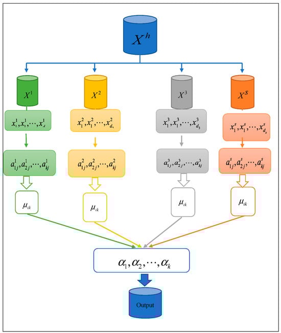 where is the hth view weight with , is used to regulate the view weights, and where , and has four cases including and , and is a parameter used to control the penalty related to the disagreement. The term, aims at reducing the disagreement between organizations on different views. The clustering process of the WV-Co-FCM is based on minimizing the objective function that highlights the fuzzy partition for a dataset using the collaborative clustering technique, and the weight of each view that can be achieved by adding the entropy regularization term. The WV-Co-FCM is used to tackle the multiview data and the weights are utilized in the last step. That is, the membership for each object and cluster center is updated independently with the influence of weights.