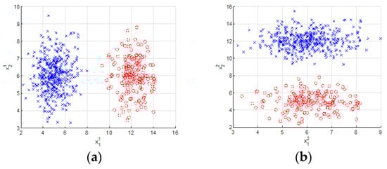 The two-view two-cluster dataset for (a) first view; (b) second view.