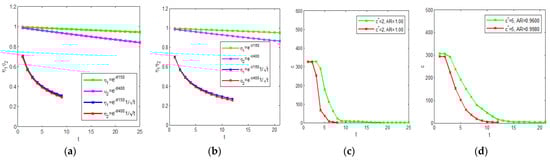 Parameter sensitivity of with Equations (15) and (18) for (a) Artificial Data 1; (b) Artificial Data 2; Further, the iterative c* when processing the U-MV-FCM in determining the optimal number of clusters c* with the learning rates of Equations (17) and (18) for (c) Artificial Data 1; (d) Artificial Data 2.