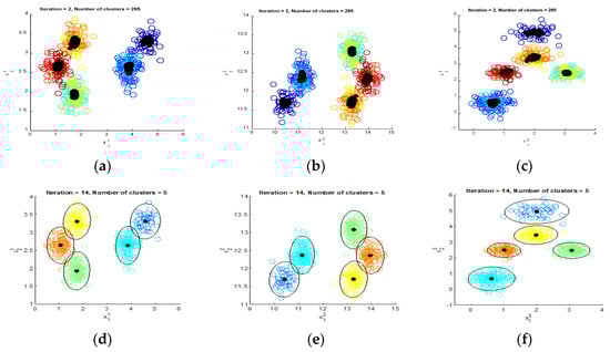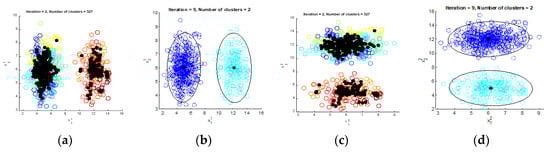 We next demonstrate the parameters and cluster behaviors for the proposed U-MV-FCM clustering algorithm. Parameter selection is one of the important step in clustering data, as the high-quality structured data will be obtained if the choice of the combination parameters is provided. The relation and interaction between , and can be parameterized and lead the proposed U-MV-FCM to give the optimal number of clusters c. As displayed in Figure 6a–d, the proposed U-MV-FCM reduced the clusters number for both views that are the first and second views of Artificial 1 from originally c = 600 to c = 327 after t = 2 and continuously reduced to c* = 2 after t = 9 with AR = 1.00. For Artificial 2 as shown in Figure 7a–f, the proposed U-MV-FCM processed the data from the three views from originally c = 500 to 295 after the second iteration and converged after fourteen iterations with c* = 5 and AR = 0.9980.