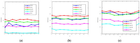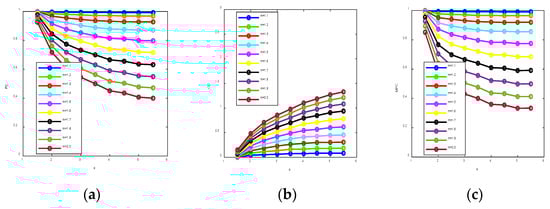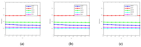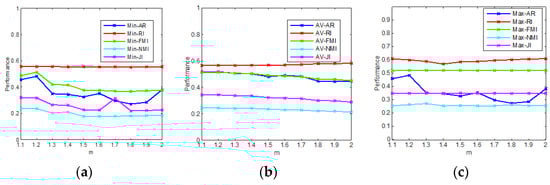 Figure 10 portrays the performance results for the Co-FKM on WebKB data. The Min-AR, Min-RI, and Min-NMI in Figure 10a show an irregular pattern, initially decreases and reaches stability when m = 1.9. The Min-FMI and Min-JI show a downward trend when m = 1.1, but stable when m = 1.3. The Avg-AR, Avg-NMI, Avg-FMI, and Avg-JI in Figure 10b is stable when m = 1.2. The Avg-RI in Figure 10c reaches stability over the entire m.