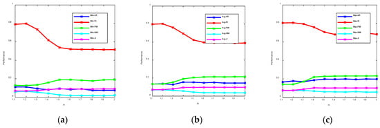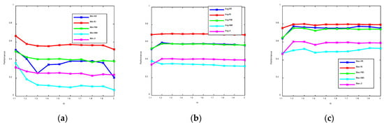 Figure 9 shows the performance results for the Co-FKM on the Wikipedia Articles dataset. The Min-AR, Min-RI, Min-FMI, Min-NMI, and Min-JI in Figure 9a show a downward pattern. The Avg-AR, Avg-RI, Avg-FMI, Avg-NMI, and Avg-JI in Figure 9b show a downward trend when m = 1.1, but stable when m = 1.3, and a decreasing movement when m = 1.9. The Max-AR, Max-FMI, and Max-JI in Figure 9c is stable when m =1.1, but a descending trend at m = 1.8. The Max-RI and Max-NMI have a downward trend when m = 1.9.