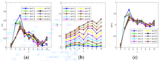 Cluster validity indices results on Syn500 data with m ranging from 1.1 to 2.0 and to for (a) Co-FKM+PC; (b) Co-FKM+PE; (c) Co-FKM+MPC.