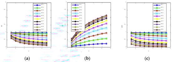 Cluster validity indices results on Artificial 2 data with m ranging from 1.1 to 2.0 and to for (a) WV-Co-FCM+PC; (b) WV-Co-FCM+PE; (c) WV-Co-FCM+MPC.
